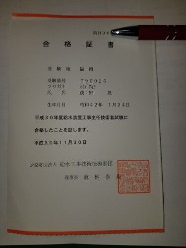 給水装置工事主任技術者の試験に合格しました 大分実績を重ねる注文住宅を提案する事務所が発信するブログをご覧ください